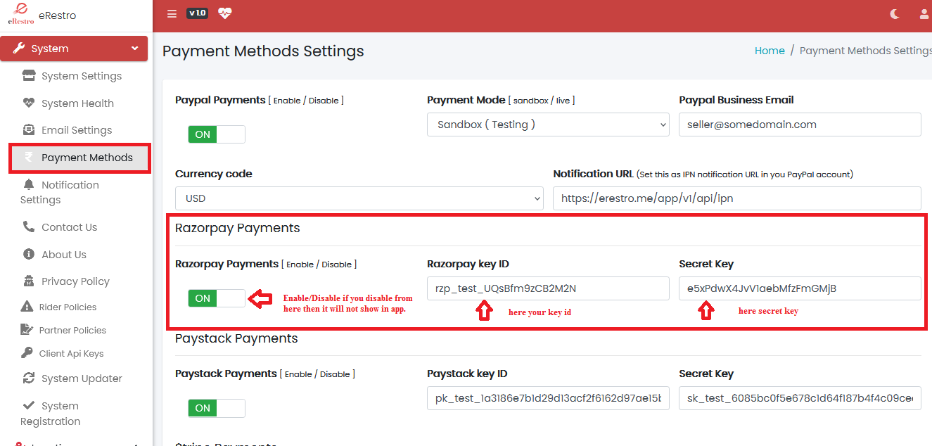 - go to the panel, in that system > payment mehod. for any payment method you have to add just key id and secrect key.and if you don't wanat to use then disable from here.